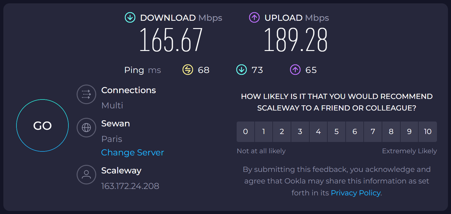 Тестовая скорость соединения по Vless-протоколу на скриншоте ниже. Особенно хорошо выглядит показатель пинга :)