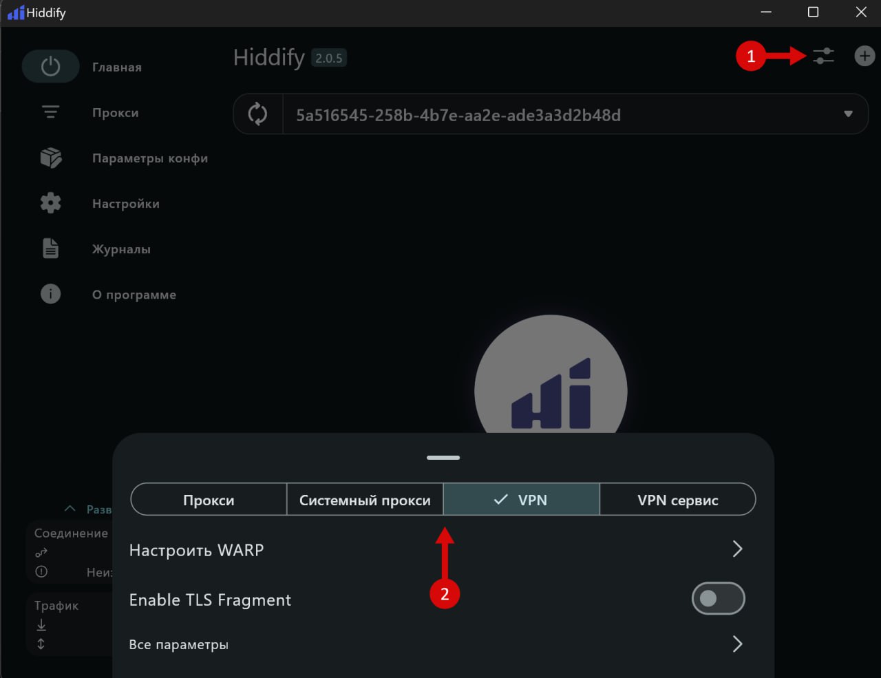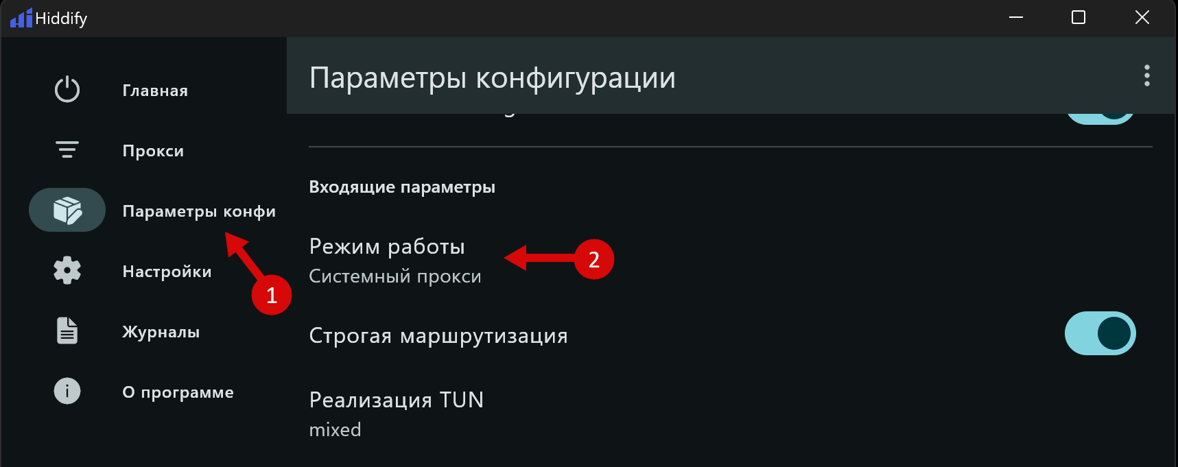 Приложение Hiddify Next может работать в нескольких режимах. Каждый режим имеет свои особенности, и может работать или не работать в определенных условиях. Всегда можно проверить другие варианты. Для того, чтобы узнать текущий вариант или изменить на другой, можно воспользоваться оним из трех способов: