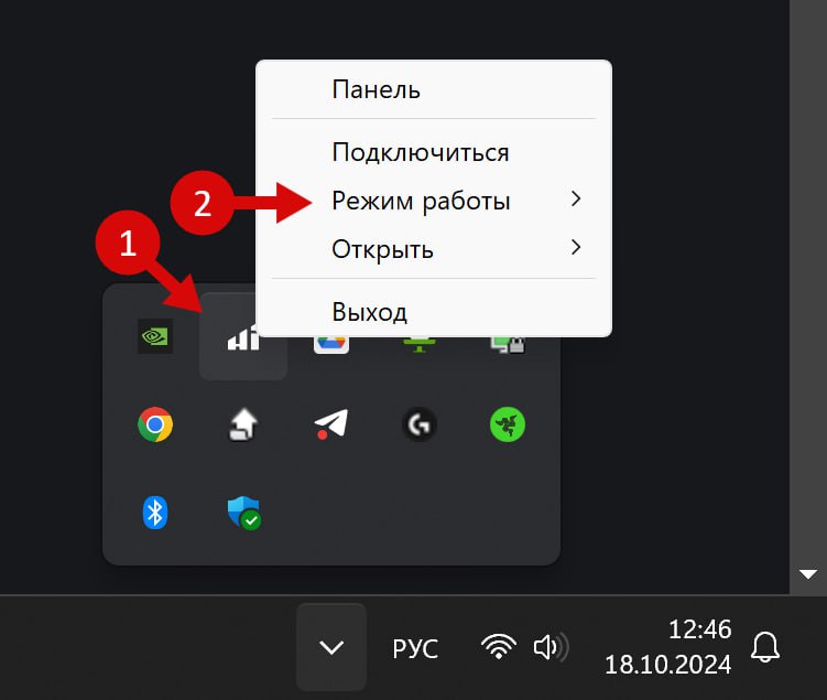 Опционально: Найти в трее ПК (правый нижний угол рядом с часами) иконку приложения, нажать на нее правой кнопкой мыши и выбрать: “Режим работы” > “VPN (Экспериментальный)” или “VPN сервис (Экспериментальный)”