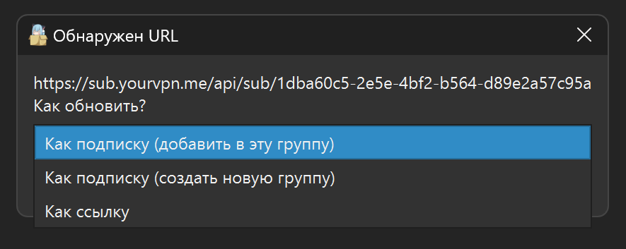 В приложении в верхей панели инструментов выбрать “Сервер” > “Добавить профиль из буфера обмена”.Если добавляется подписка, выбрать вариант вставки “Как подписку (добавить в эту группу)” или “Как подписку (создать новую группу)”.