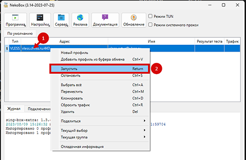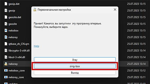 Запустить файл с названием “nekoray.exe” от имени Администратора, и выбрать кнопку “sing-box”.