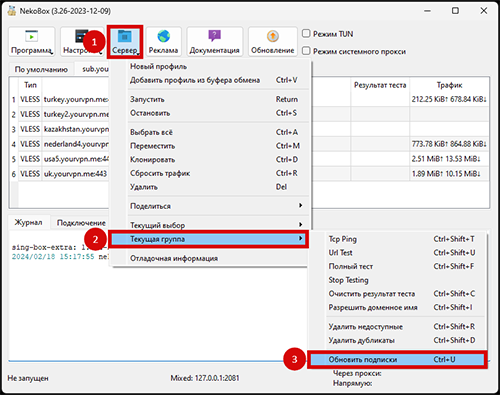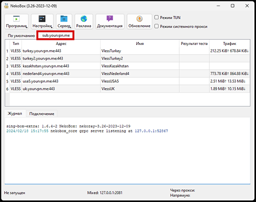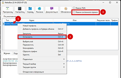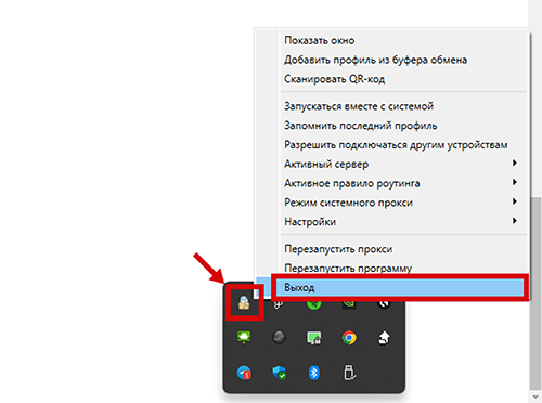 Чтобы выключить VPN, небходимо снова кликнуть правой кнопкой мыши по серверу и выбрать “Остановить”, затем отключить “Режим системного прокси”. Для того, чтобы полностью выключить приложение, необходимо в трее компьютера (в правом нижнем углу, рядом с часами) найти приложение “NekoBox”, кликнуть правой кнопкой мыши и выбрать “Выход”.