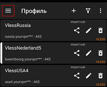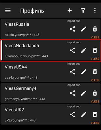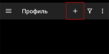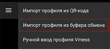 - В правом верхнем углу нажать на кнопку с плюсом “+” и выбрать “Импорт профиля из буфера обмена”