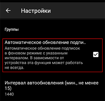 - Пролистать до раздела “Группы” и включить “Автоматическое обновления подписок”