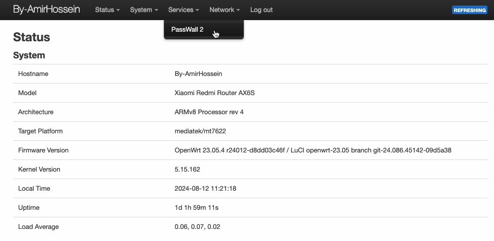 В главном меню выберите пункт Passwall2 в разделе Services для перехода в раздел настройки VPN