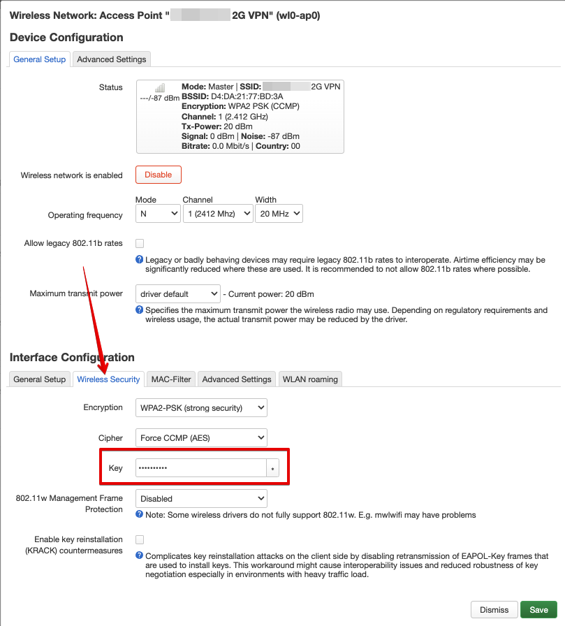 Новый пароль указывается в поле “Key” на вкладке “Wireless Security” в блоке “Interface Configuration”