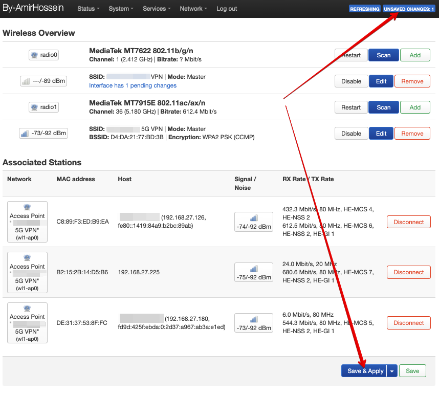 Счетчик “Unsaved changes” в шапке страницы покажет кол-во не примененных изменений. Примените их нажатием кнопки "Save&Apply"